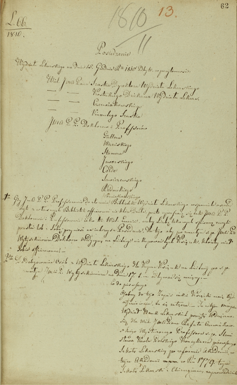 - Pierwsza strona "Protokołu z posiedzenia Wydziału Lekarskiego 15 grudnia 1810 roku". W tym dniu, dzięki staraniom Sebastiana Girtlera i donacji Rafała Czerwiakowskiego, powołano do życia Bibliotekę Wydziału Lekarskiego i określono zasady jej działania.