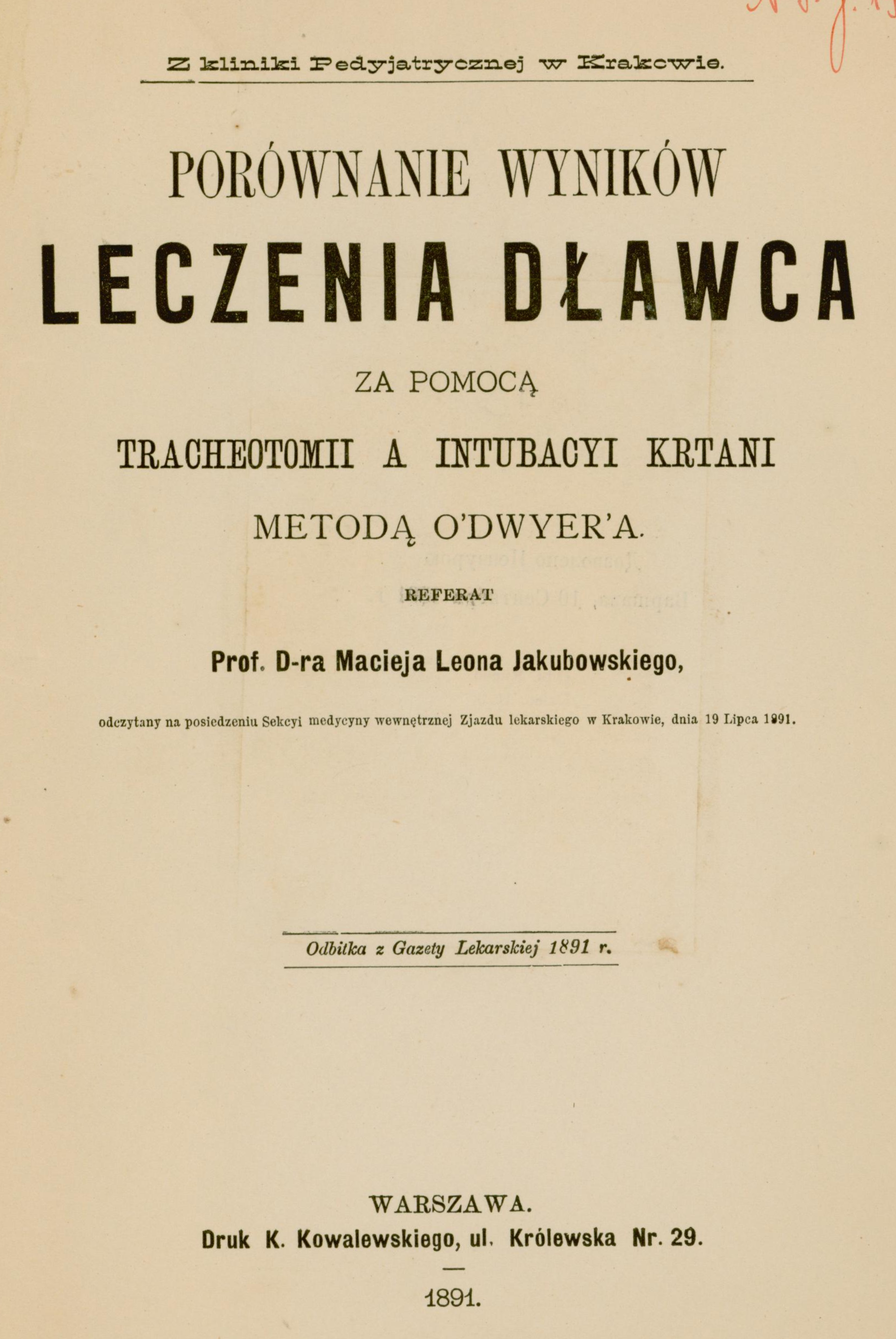 Porównanie wyników leczenia dławca za pomocą tracheotomii a intubacyi krtani metodą O'Dwyer'a / Maciej Leon Jakubowski. - Warszawa, 1891