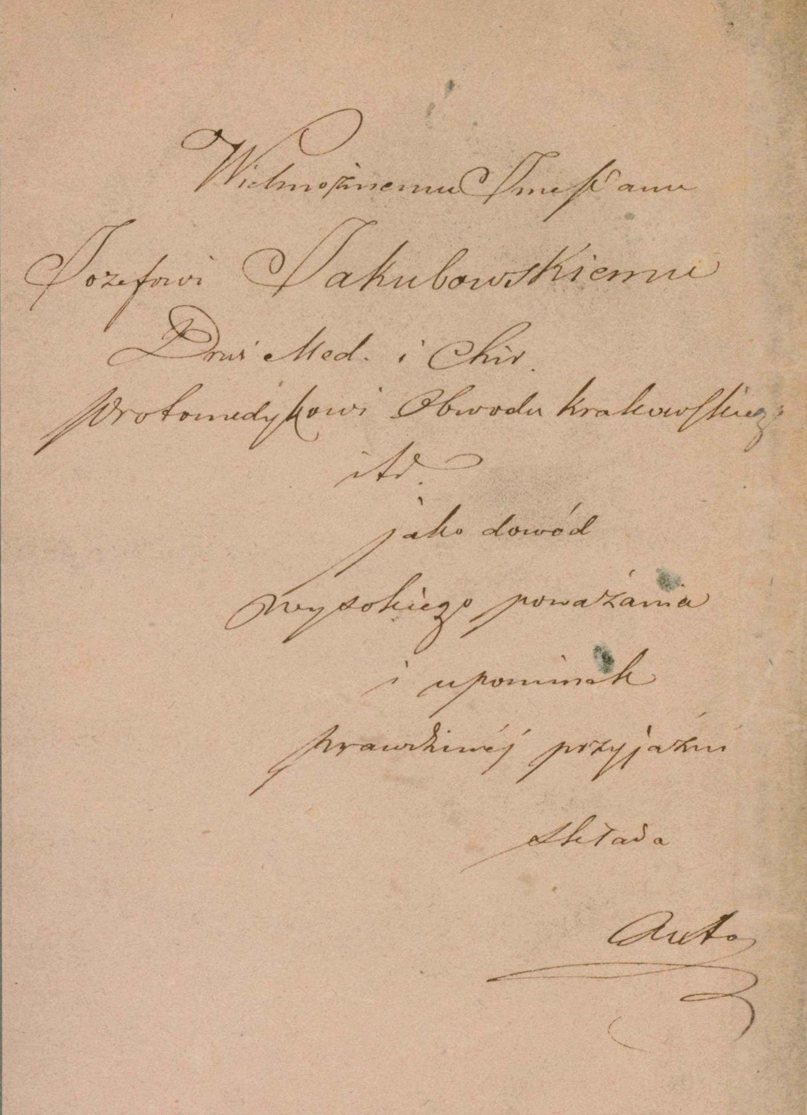 - Dedykacja prof. Józefa Majera dla prof. Józefa Jakubowskiego w pracy "Rozbiór fizyologiczny wprawy, przyzwyczajenia i nałogu"