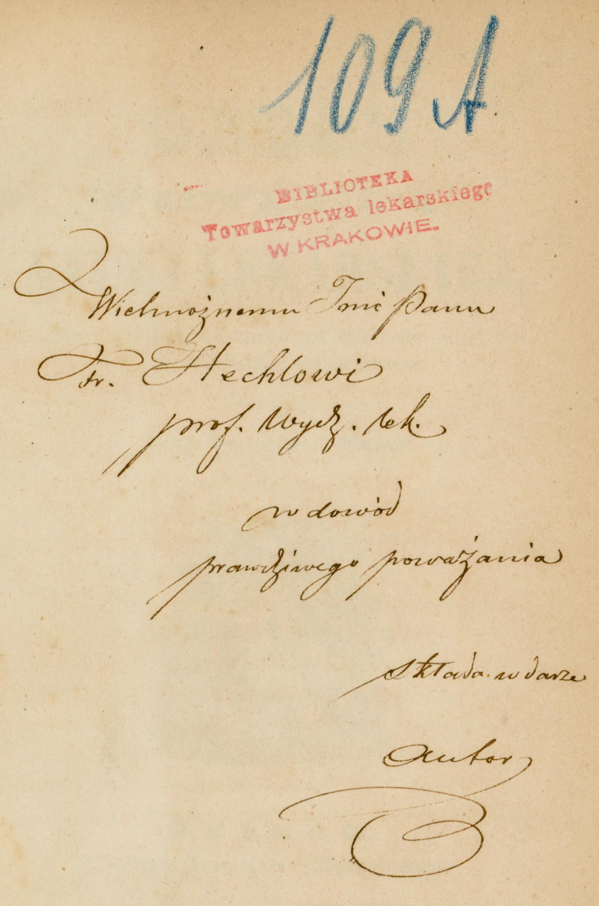 Dedykacja prof. Józefa Majera dla prof. Fryderyka Hechla w „Obraz postępu nauki lekarskiéj, o ile nań wpłynęły pisma polskie, lub przez Polaków w trzech ostatnich latach wydane”.