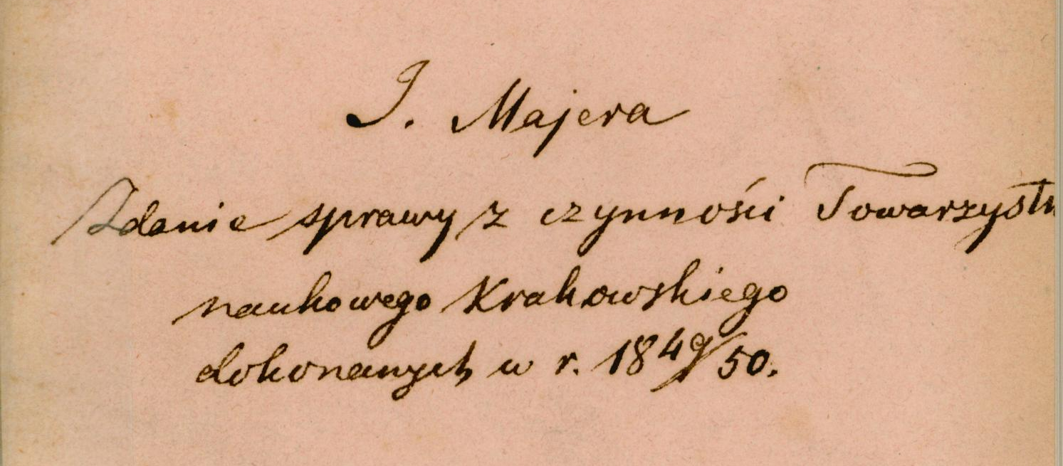 - Zdanie sprawy z czynności Towarzystwa Naukowego Krakowskiego z Uniwersytetem Jagiellońskim złączonego, dokonanych w r. 1849/50 : odczytane na publiczném posiedzeniu tegoż Towarzystwa w d. 26 października 1850 r. / przez Józefa Majera. - Kraków, 1851