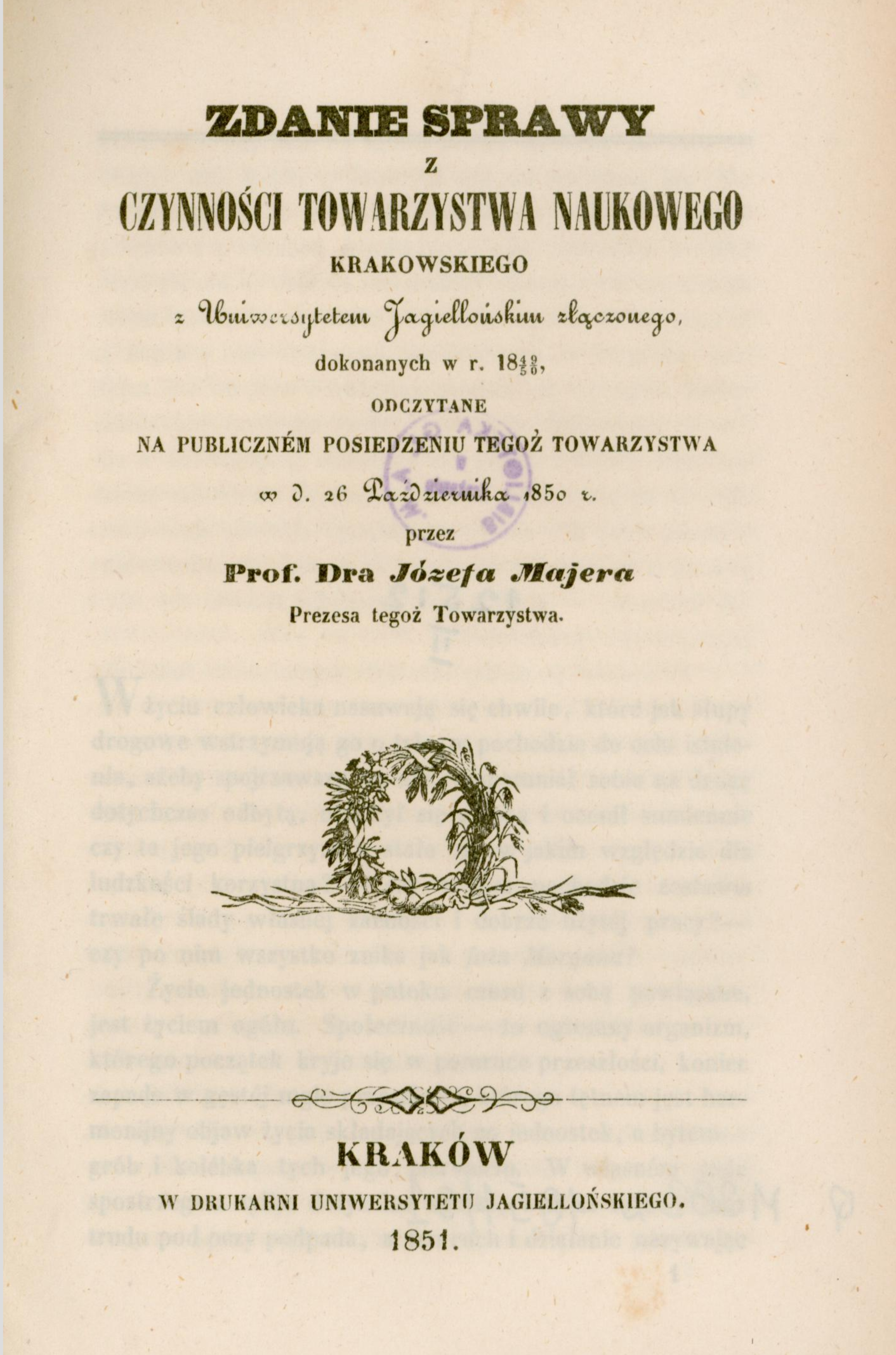 - Strona tytułowa „Zdanie sprawy z czynności Towarzystwa Naukowego Krakowskiego z Uniwersytetem Jagiellońskim złączonego, dokonanych w r. 1849, odczytane na publicznem posiedzeniu tegoż Towarzystwa w d. 26 Października 1850 r.” prof. dr. J. Majera z 1851 r.