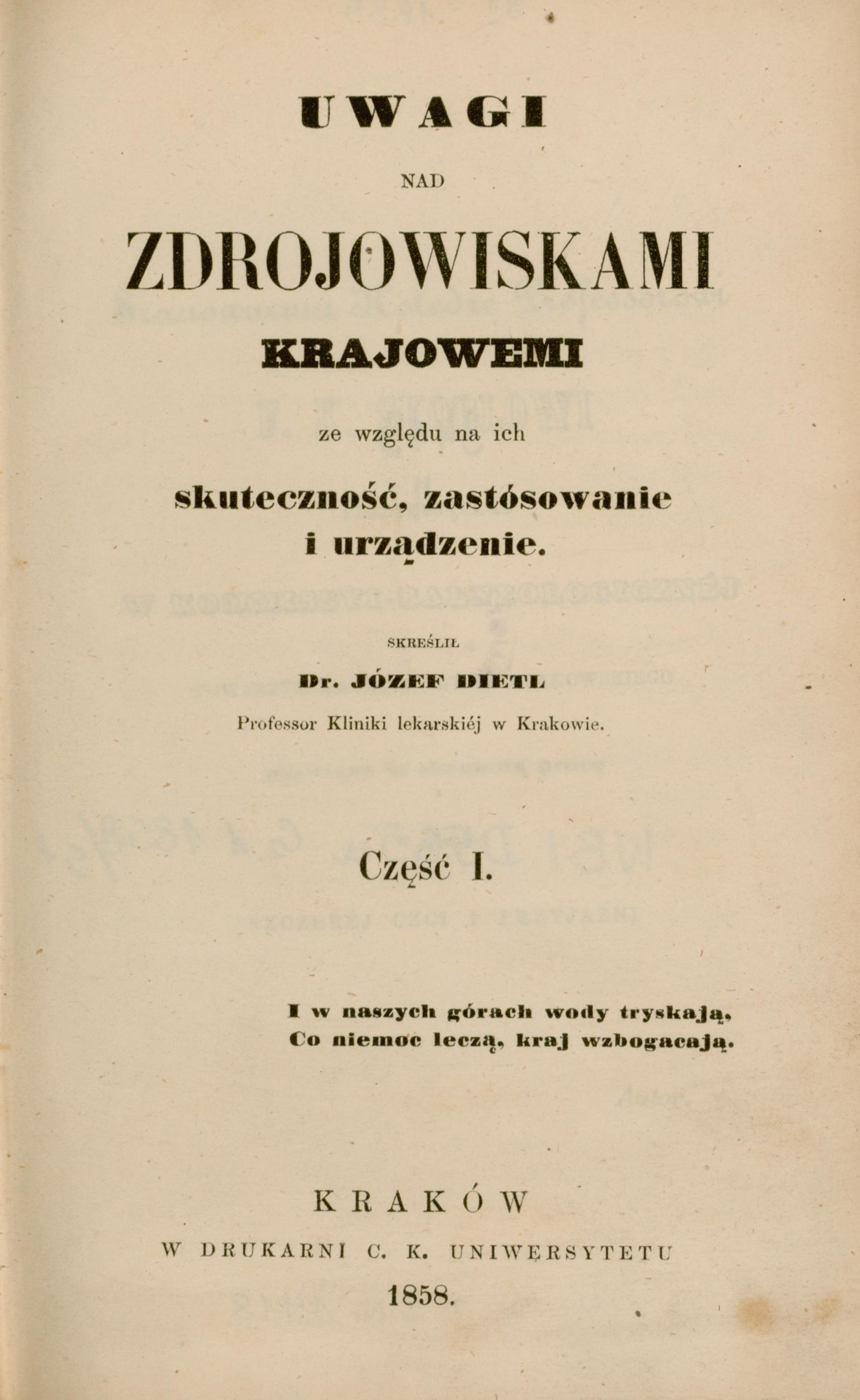 - Uwagi nad zdrojowiskami krajowemi ze wzglęsu na ich skuteczność, zastósowanie i urządzenie. Cz. 1 / Józef Dietl. - Kraków, 1858