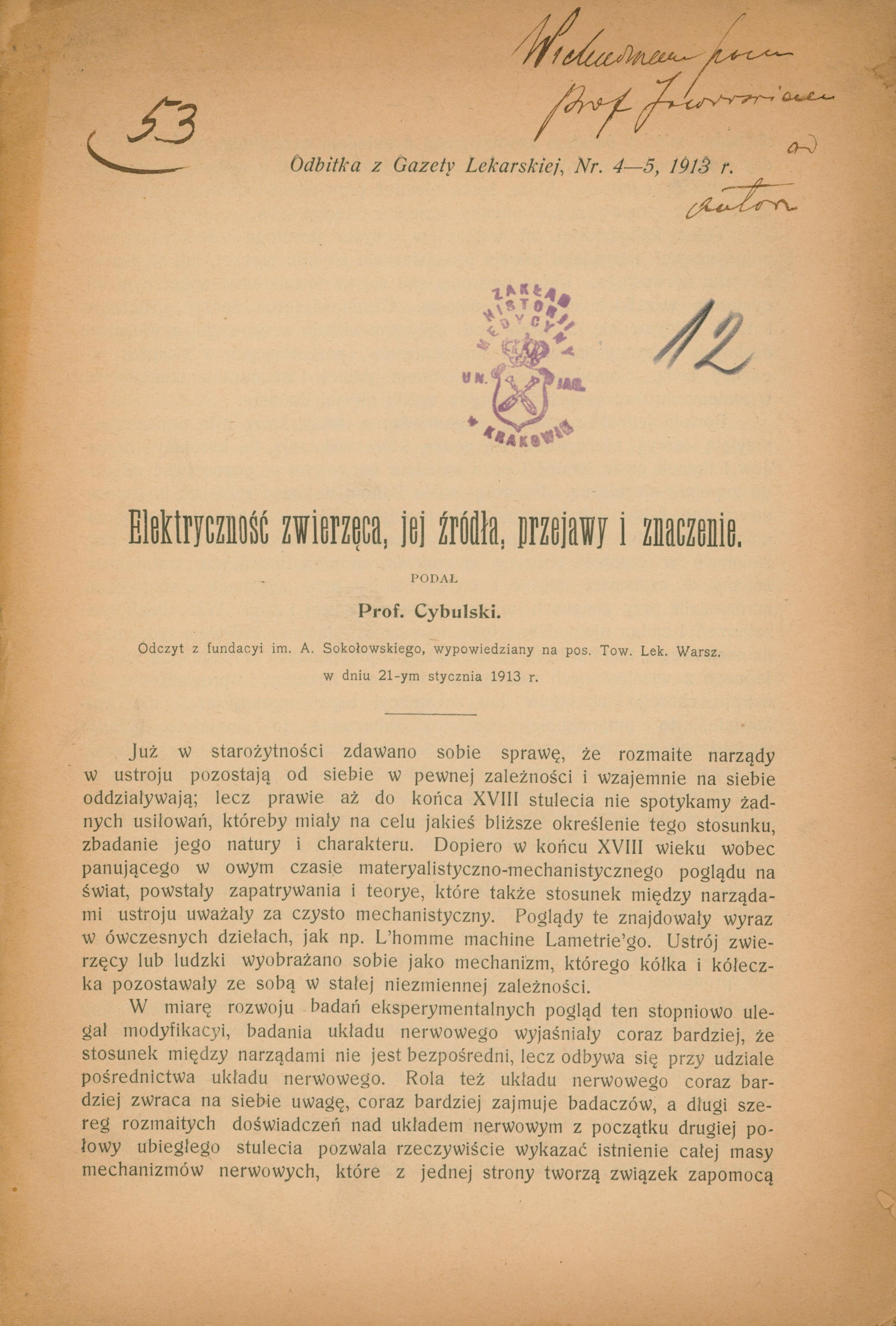 - Elektryczność zwierzęca, jej źródła, przejawy i znaczenie / Cybulski. - Warszawa, 1913