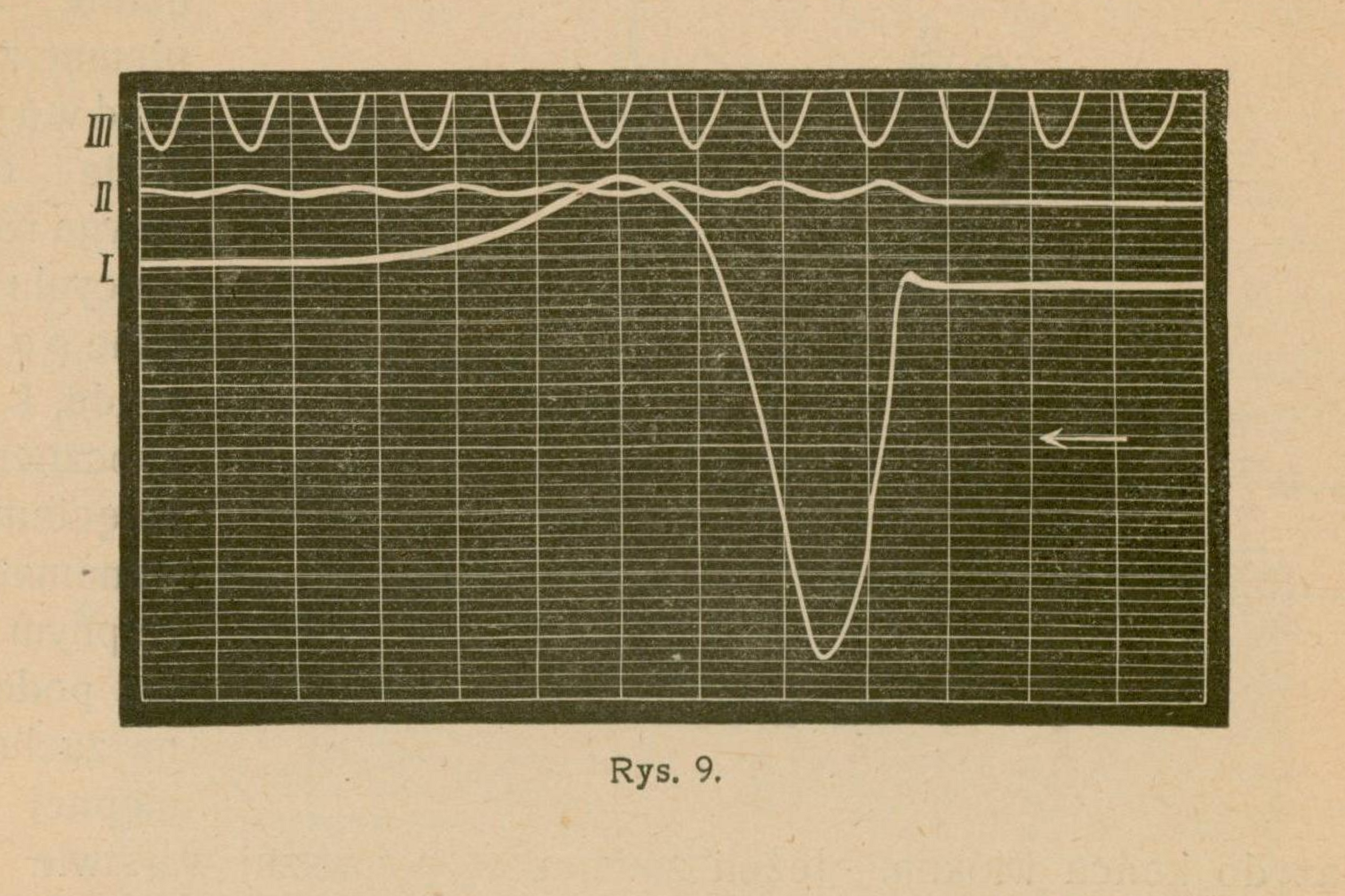 - Wykres z trzema poziomymi liniami oznaczonymi I, II, III oraz wykreśloną krzywą przedstawiającą zmiany potencjału elektrycznego w czasie w komórce pobudzonej.