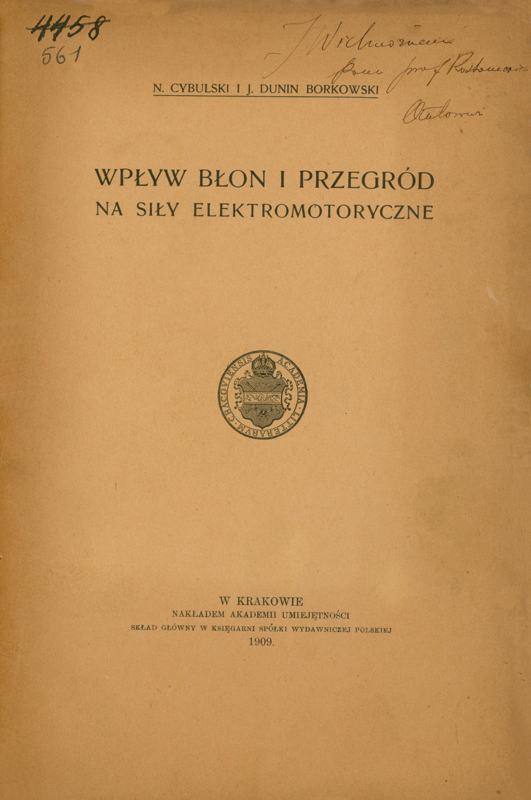 - W pływ błon i przegród na siły elektomotoryczne /N. Cybulski, J. Dunin Borkowski. - Kraków, 1909