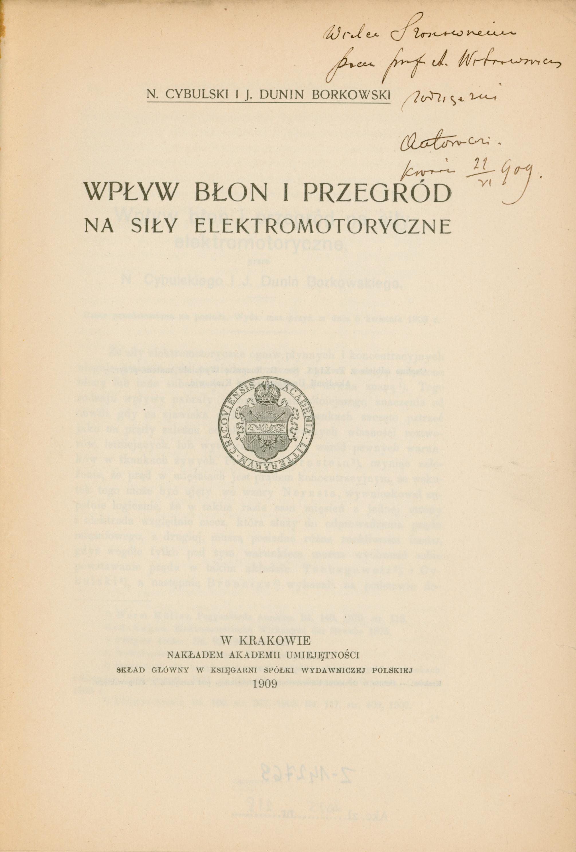 - W pływ błon i przegród na siły elektomotoryczne /N. Cybulski, J. Dunin Borkowski. - Kraków, 1909