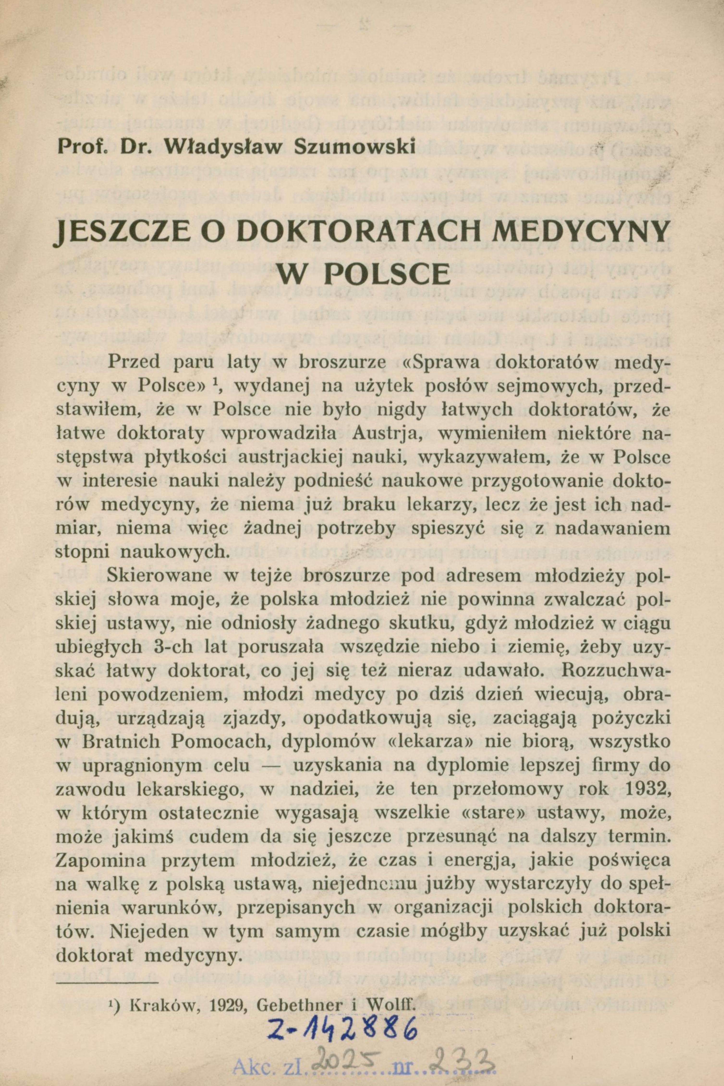 Jeszcze o doktoratach medycyny w Polsce / Władysław Szumowski. - Kraków, 1929