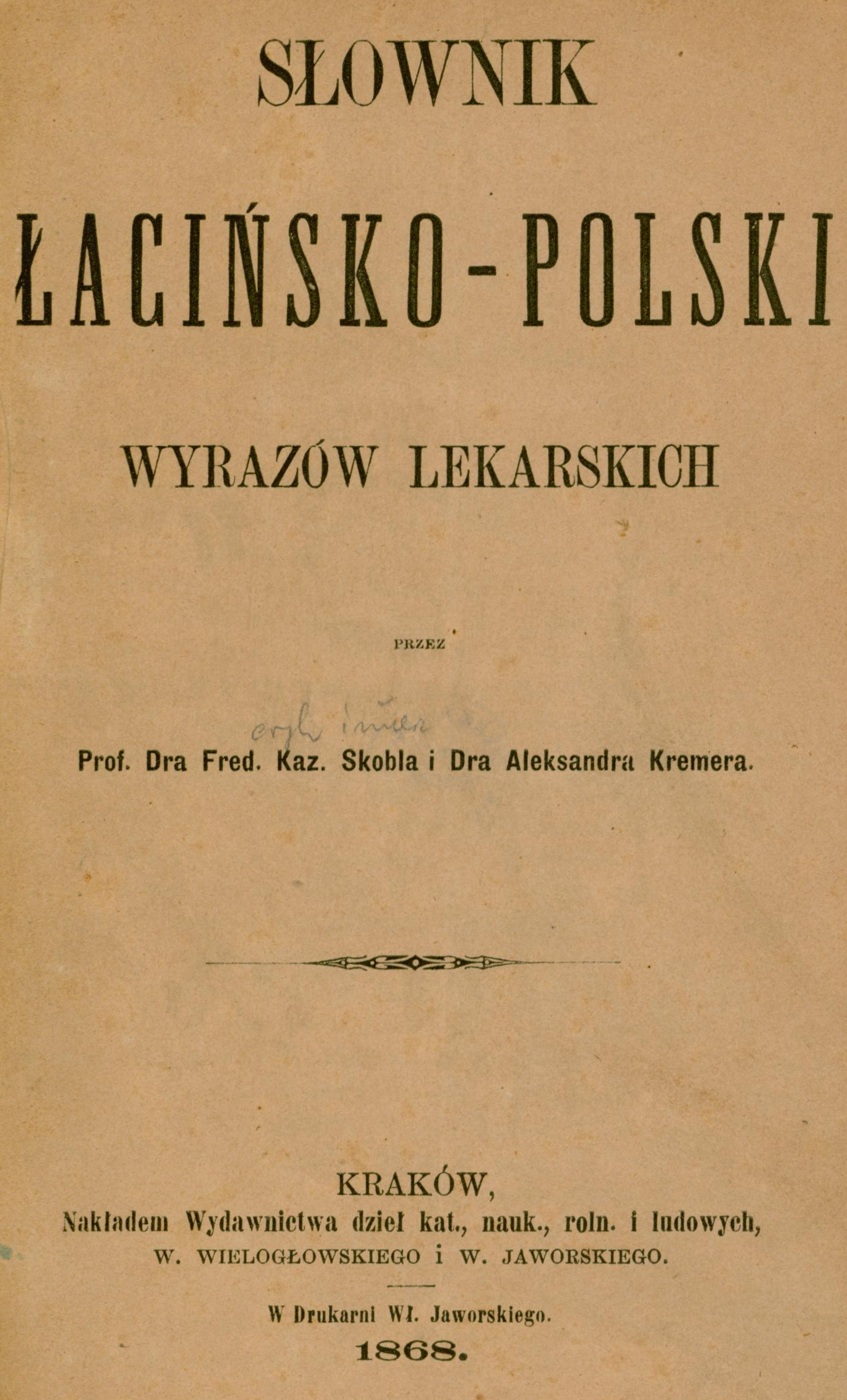 Słownik łacińsko-polski wyrazów lekarskich / Fred. Kaz. Skobel, Aleksander Kremer. - Kraków, 1868