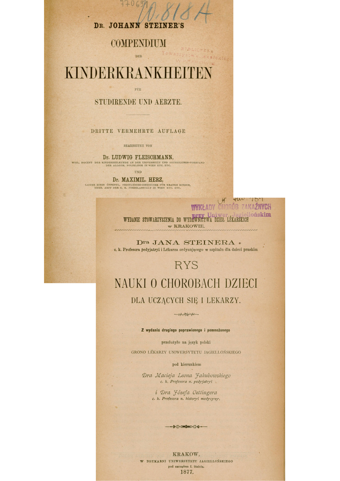 - Strona tytułowa popularnego podręcznika pediatrii Johanna Steinera oraz strona tytułowa polskiego przekładu podręcznika pediatrii Johanna Steinera.
