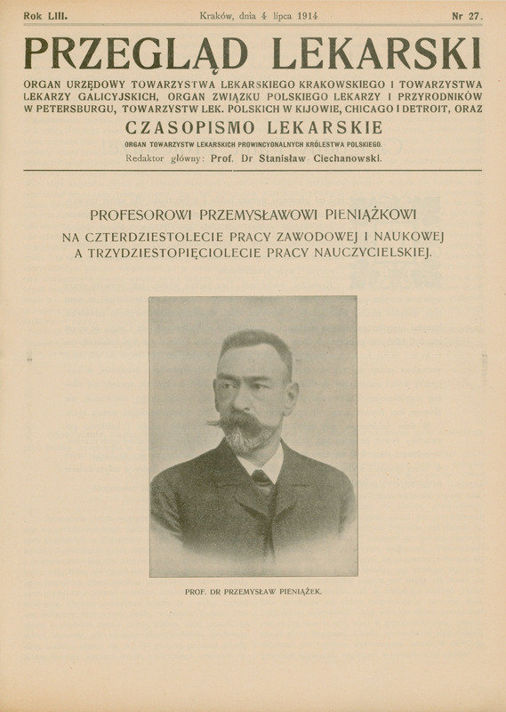 Profesorowi Przemysławowi Pieniążkowi na czterdziestolecie pracy zawodowej i naukowej a trzydziestolecie pracy nauczycielskiej // Przegląd Lekarski. - 1914, nr 27