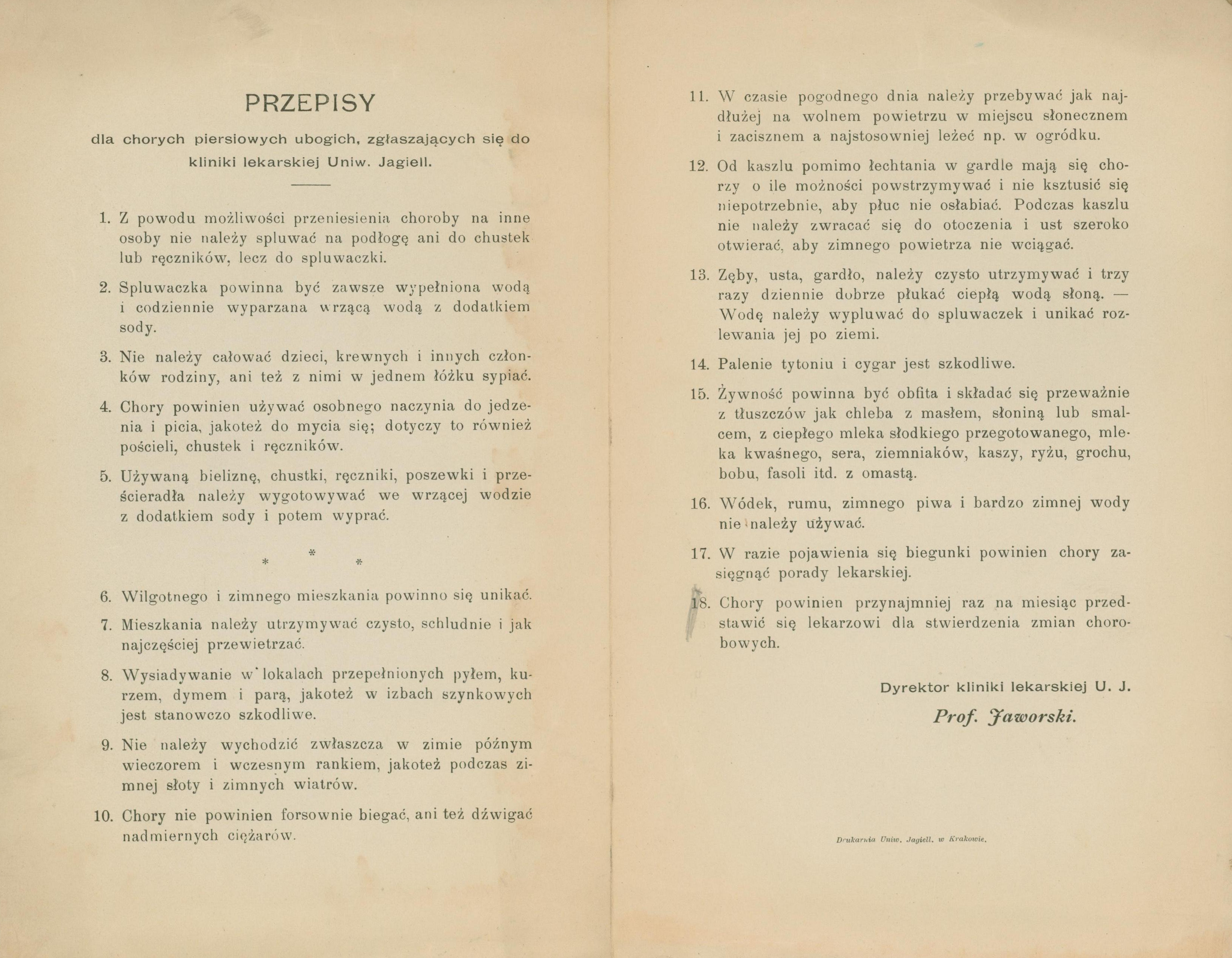 "Przepisy dla chorych piersiowych ubogich, zgłaszających się do kliniki lekarskiej Uniw. Jagiell.".