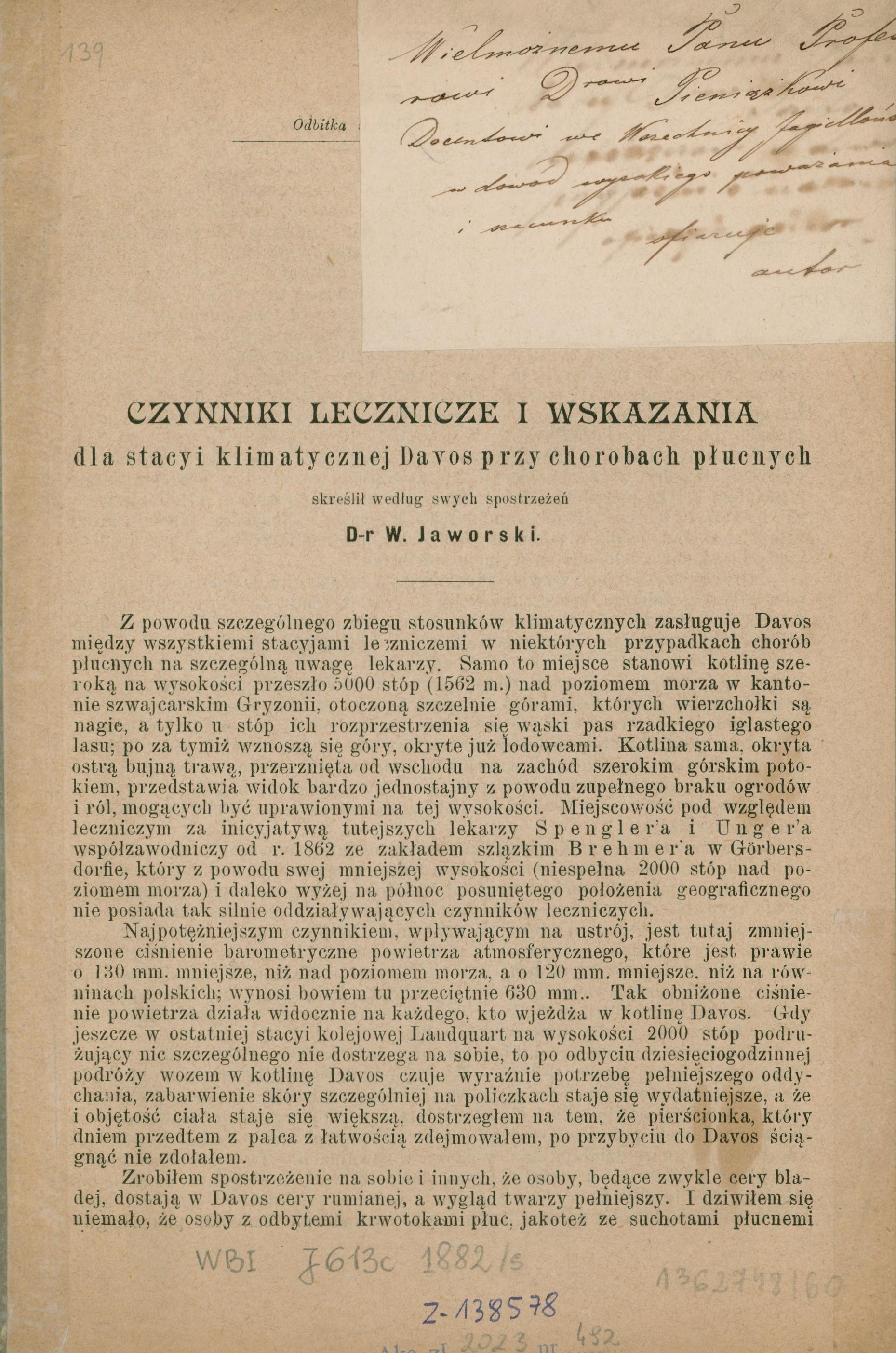 Czynniki lecznicze i wskazania dla stacyi klimatycznej Davos przy chorobach płucnych / W. Jaworski. - Warszawa, 1882