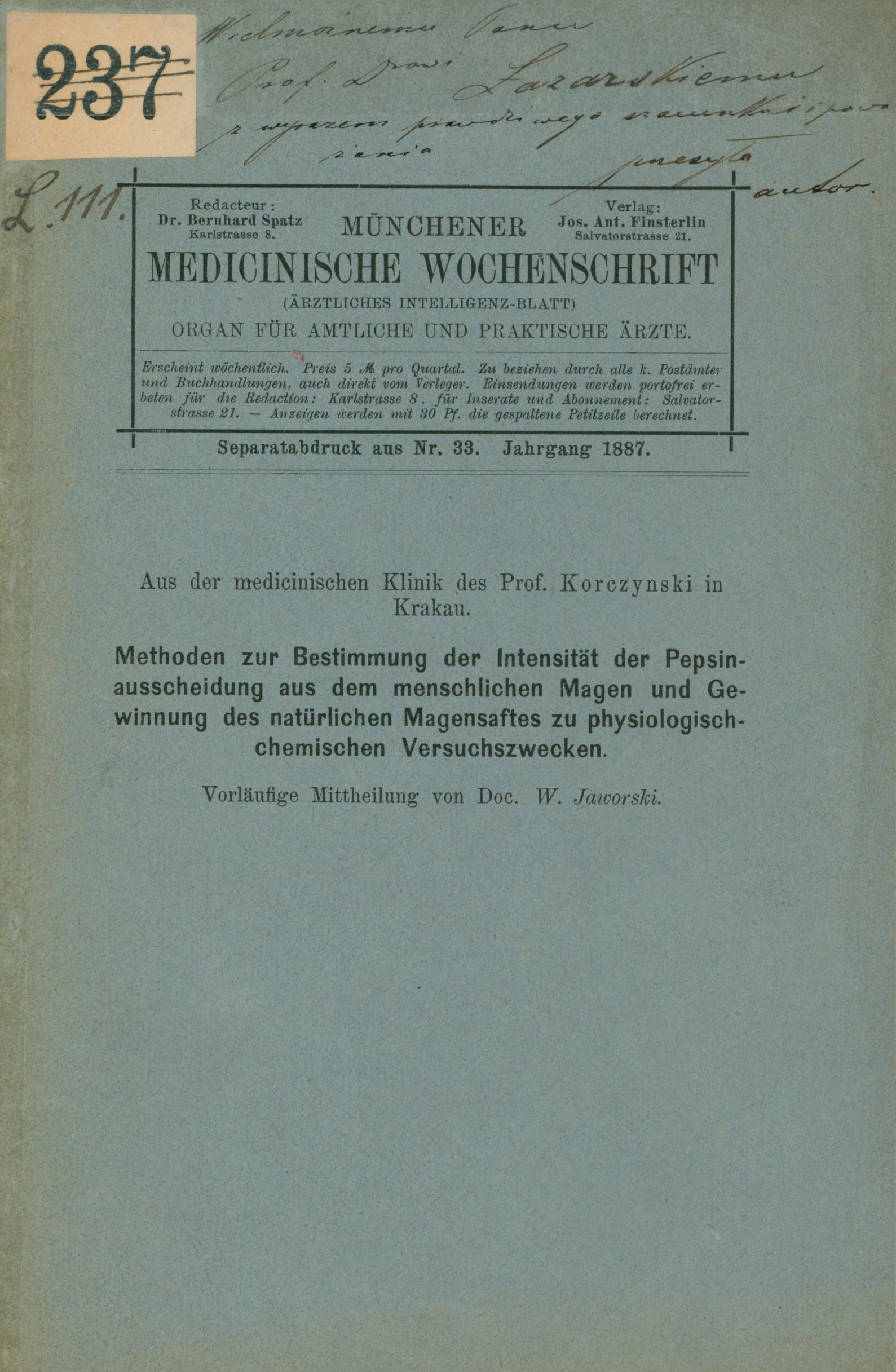 Methoden zur Bestimmung der Intensität der Pepsinausscheidung aus dem menschlichen Magen und Gewinnung des natürlichen Magensaftes zu physiologisch-chemischen Versuchszwecken / W. Jaworski. - [S.l.], 1887