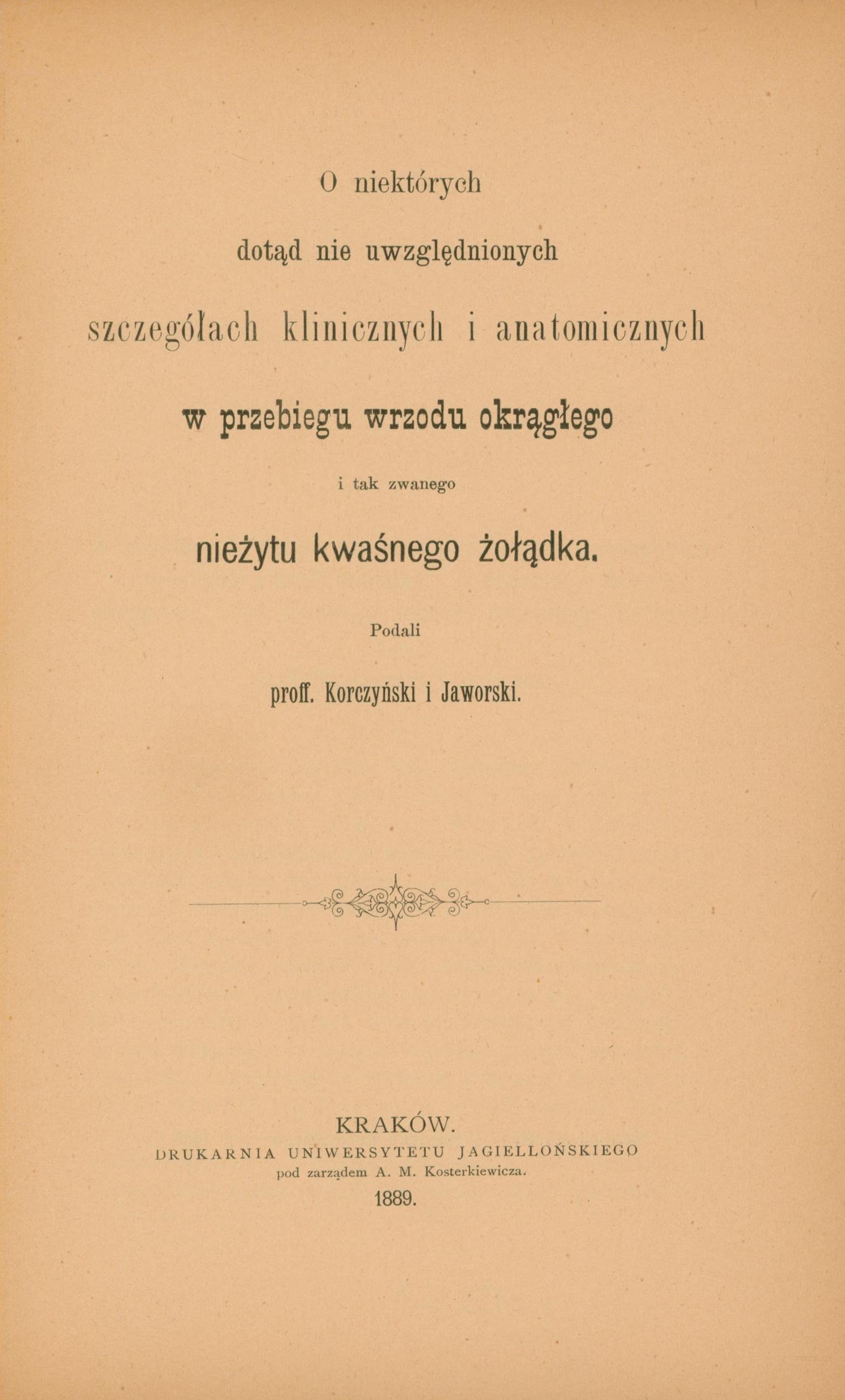 O niektórych dotąd nie uwzględnionych szczegółach klinicznych i anatomicznych w przebiegu wrzodu okrągłego i tak zwanego nieżytu kwaśnego żołądka / Korczyński, Jaworski. - Kraków, 1889