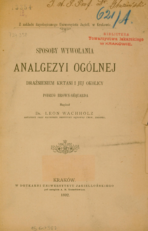 Sposoby wywołania analgezyi ogólnej drażnieniem krtani i jej okolicy podług Brown-Séquarda / Leon Wachholz. - Kraków, 1892
