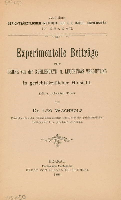 Experimentelle Beiträge zur Lehre von der Kohlenoxyd- u. Leuchtgas-Vergiftung in gerichtsärztlicher Hinsicht / Leo Wachholz. - Krakau, 1896