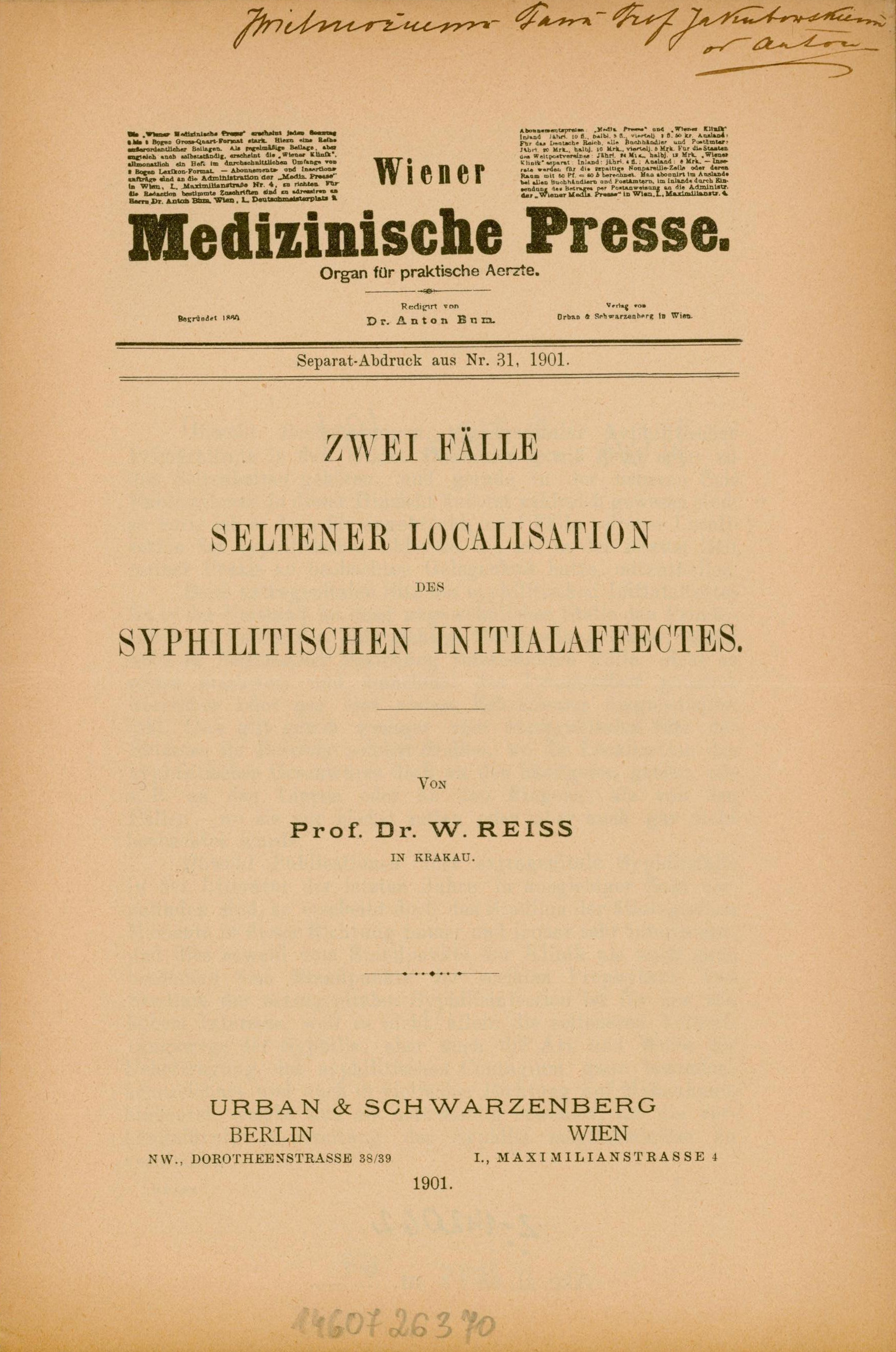 - Zwei Fälle seltener Localisation des syphilitischen Initialaffectes / W. Reiss. - Berlin ; Wien, 1901