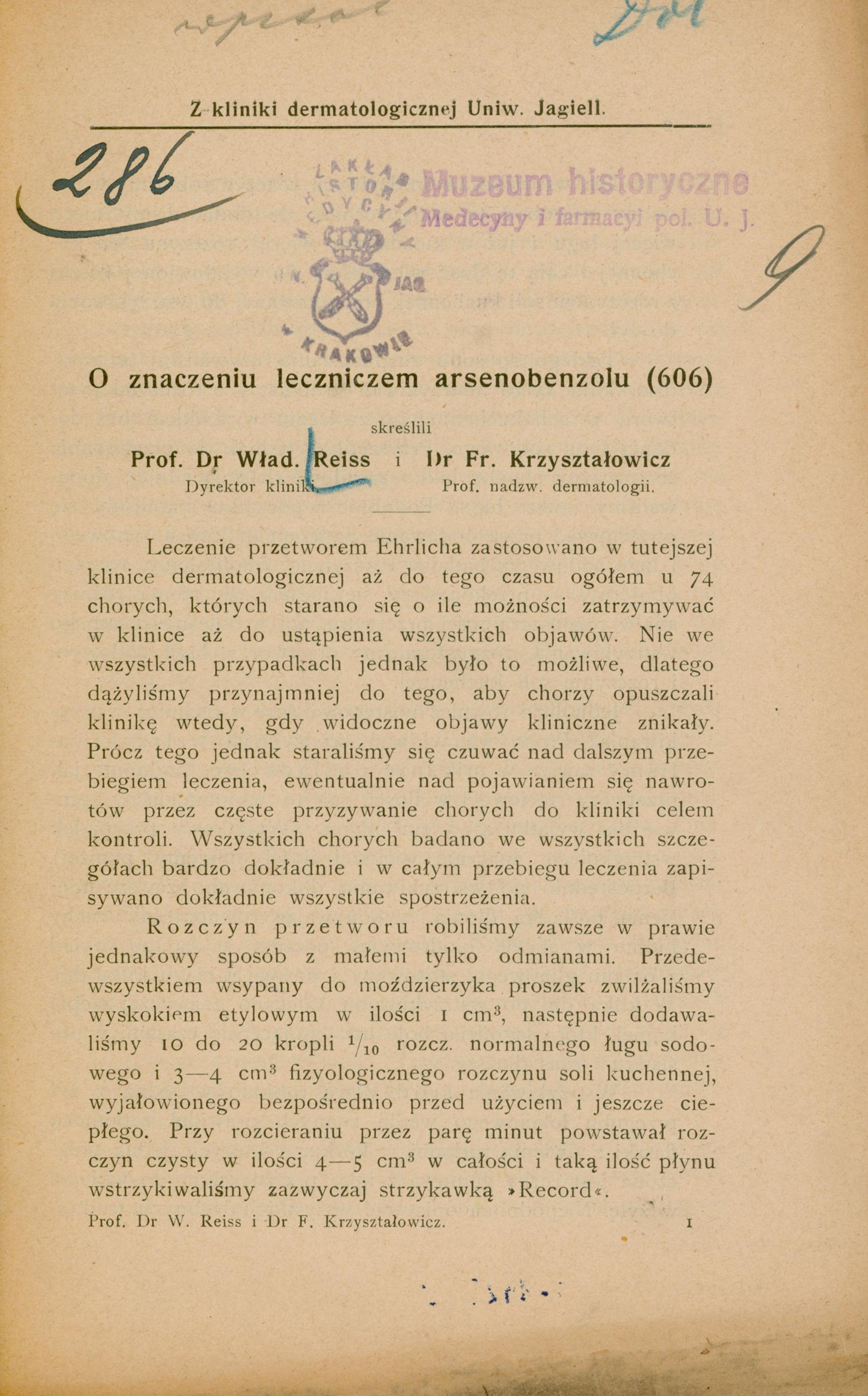 O znaczeniu leczniczem arsenobenzolu (606) / Wład. Reiss, Fr. Krzyształowicz. Kraków, 1911