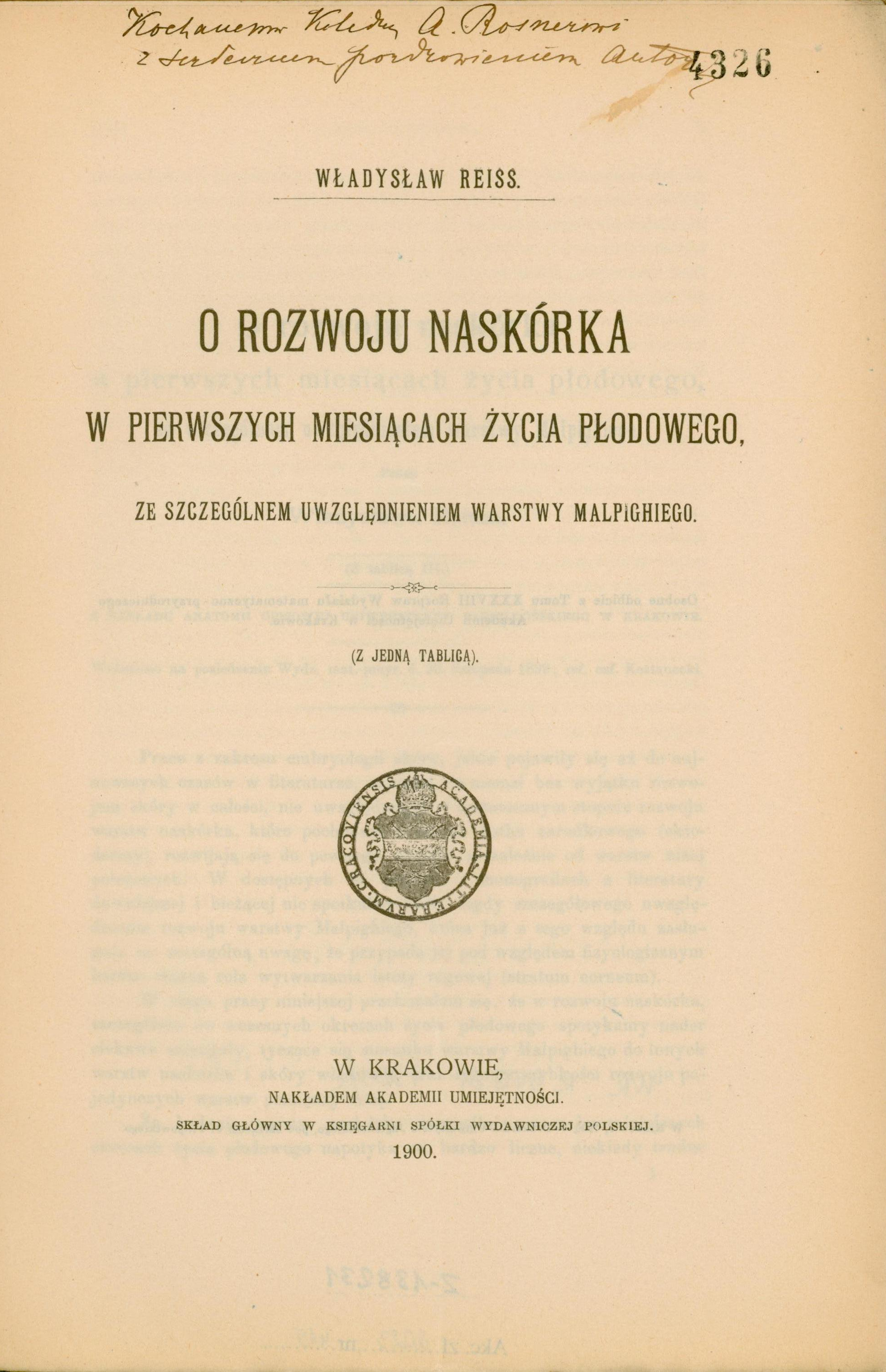 Strona tytułowa publikacji „O rozwoju naskórka w pierwszych miesiącach życia płodowego, ze szczególnem uwzględnieniem warstwy Malpighiego” z odręczną dedykacją dla prof. Antoniego Rosnera: „Kochanemu Koledze A. Rosnerowi z serdecznem pozdrowieniem Autora”.