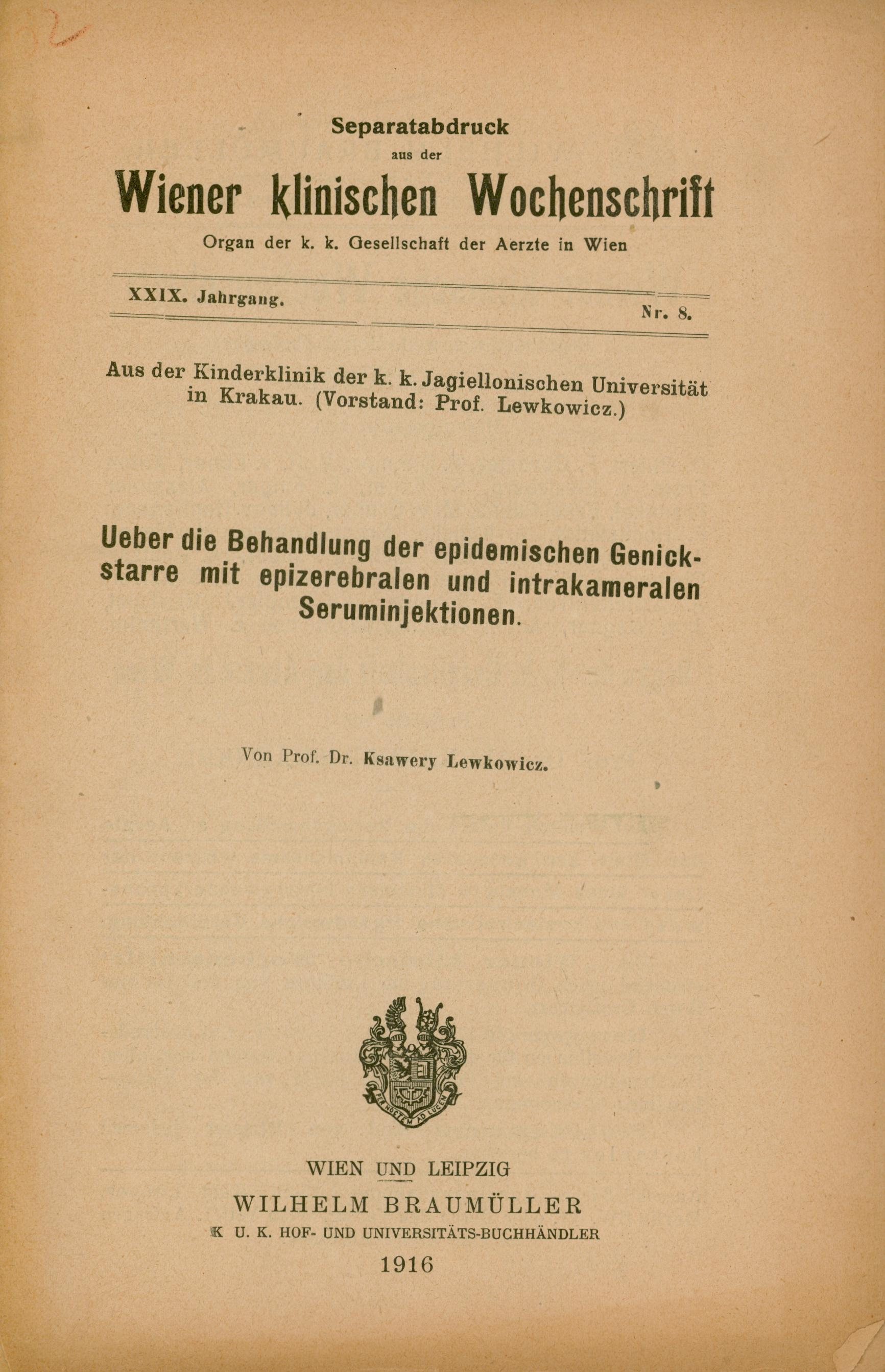 Ueber die Behandlung der epidemischen Genickstarre mit epizerebralen und intrakameralen Seruminjektionen / Ksawery Lewkowicz. - Wien ; Leipzig, 1916