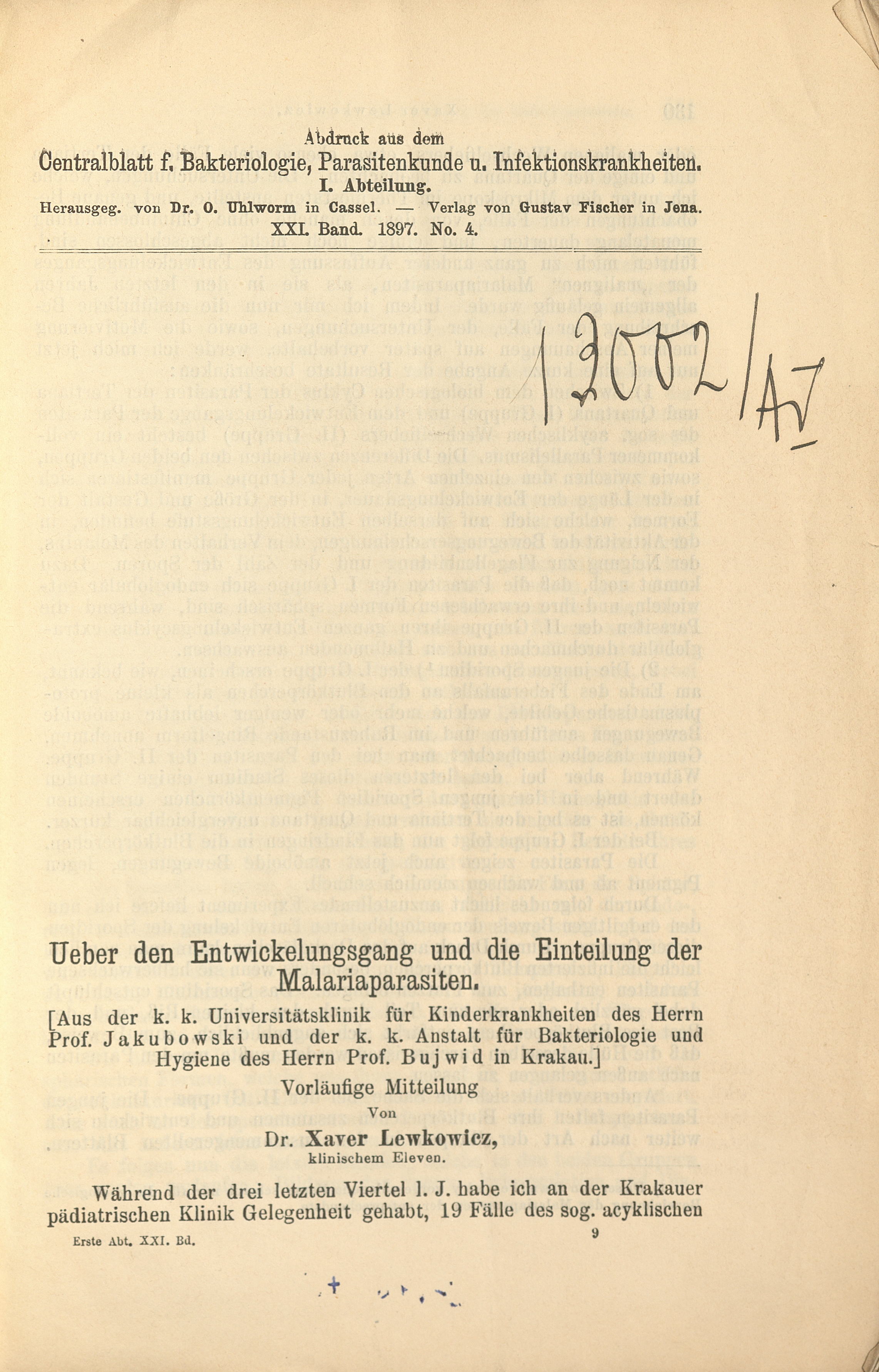 - Ueber dem Entwickelungsgang und die Einteilung der Malariaparasiten / Xaver Lewkowicz. - Jena, 1897