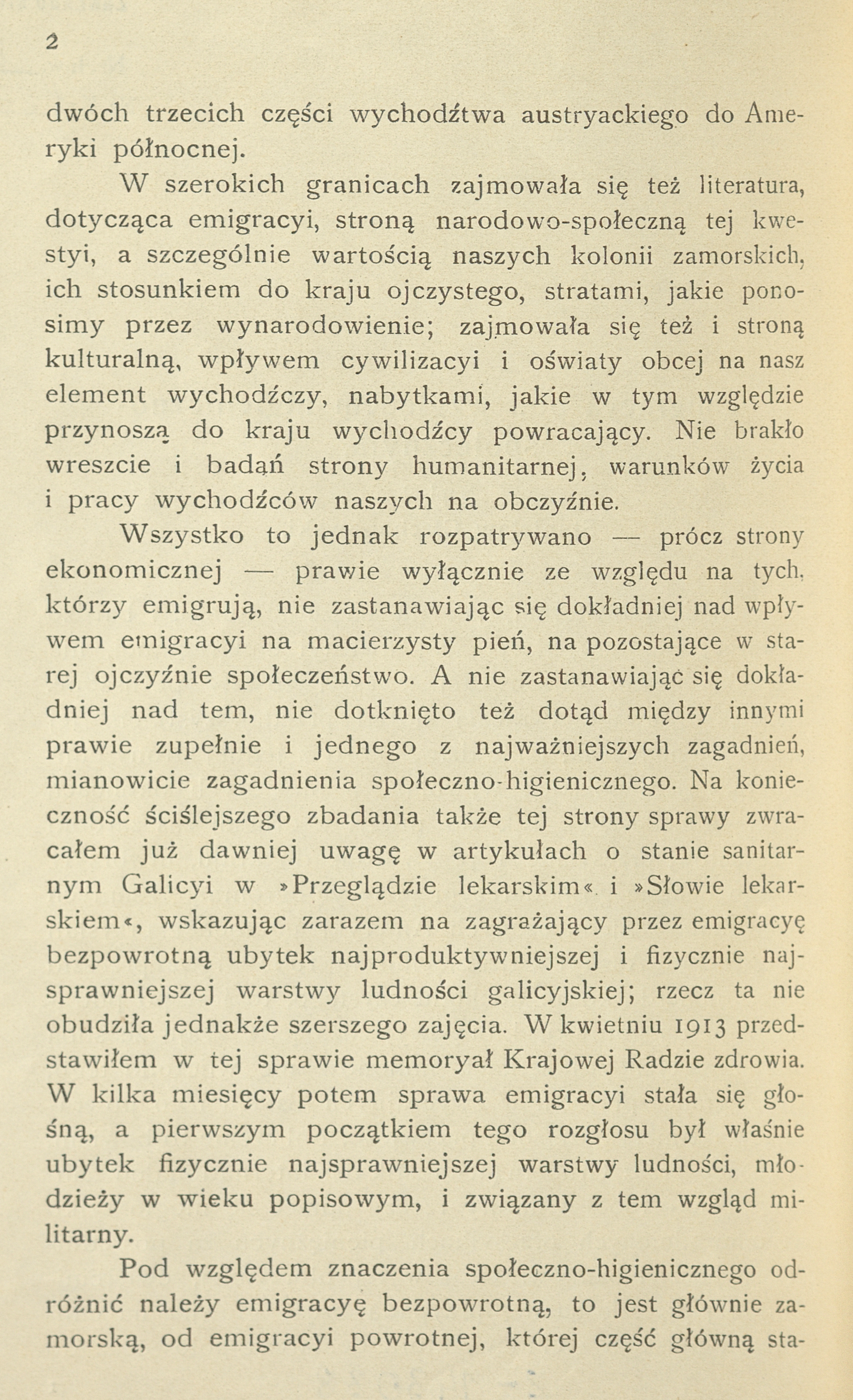 Druga strona pracy „Emigracya pod względem higieniczno-społecznym”. Kraków, 1914.