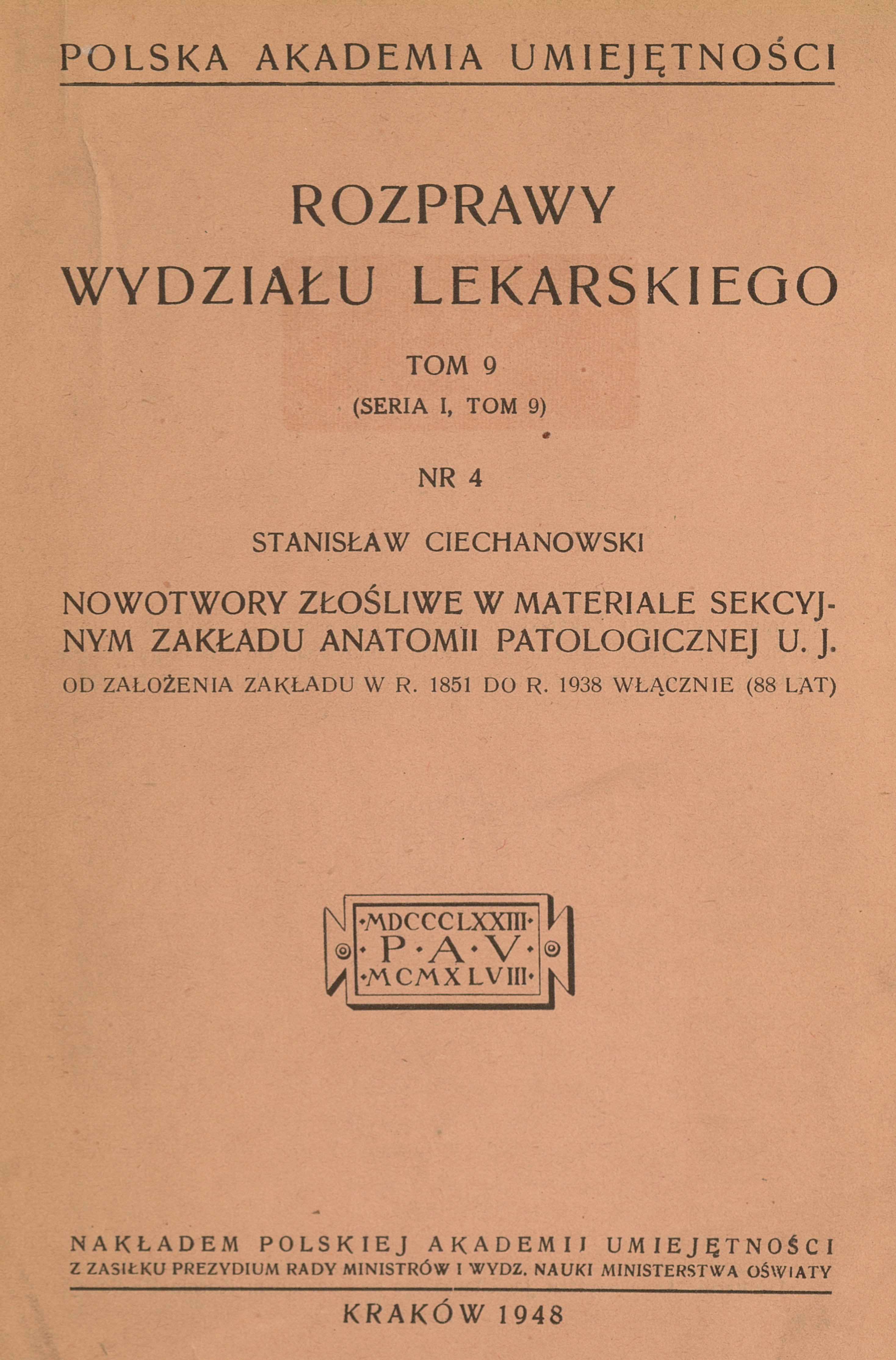 Nowotwory złośliwe w materiale sekcyjnym Zakładu Anatomii Patologicznej U. J. / Stanisław Ciechanowski.- Kraków, 1948