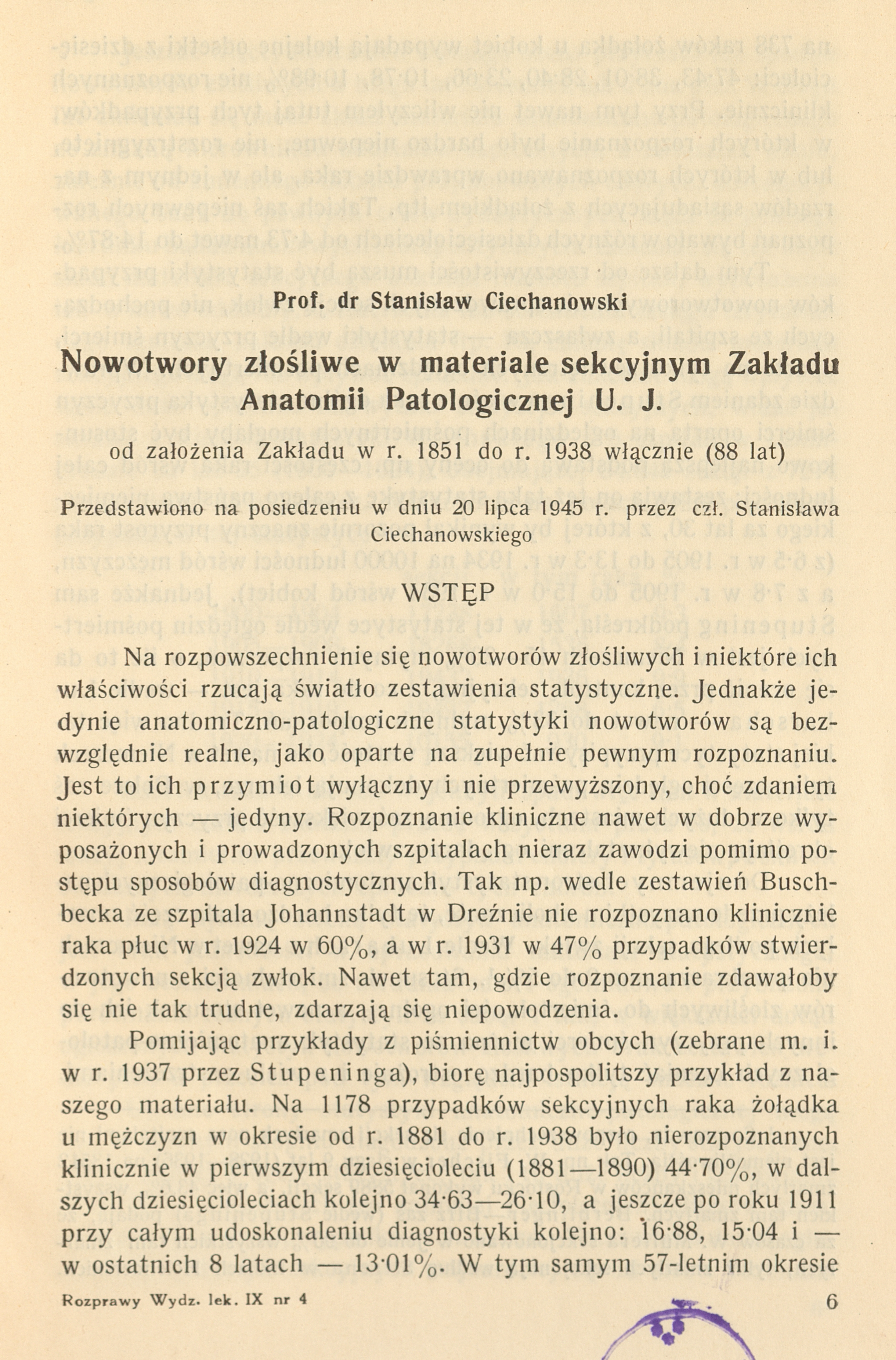 Nowotwory złośliwe w materiale sekcyjnym Zakładu Anatomii Patologicznej U. J. / Stanisław Ciechanowski.- Kraków, 1948