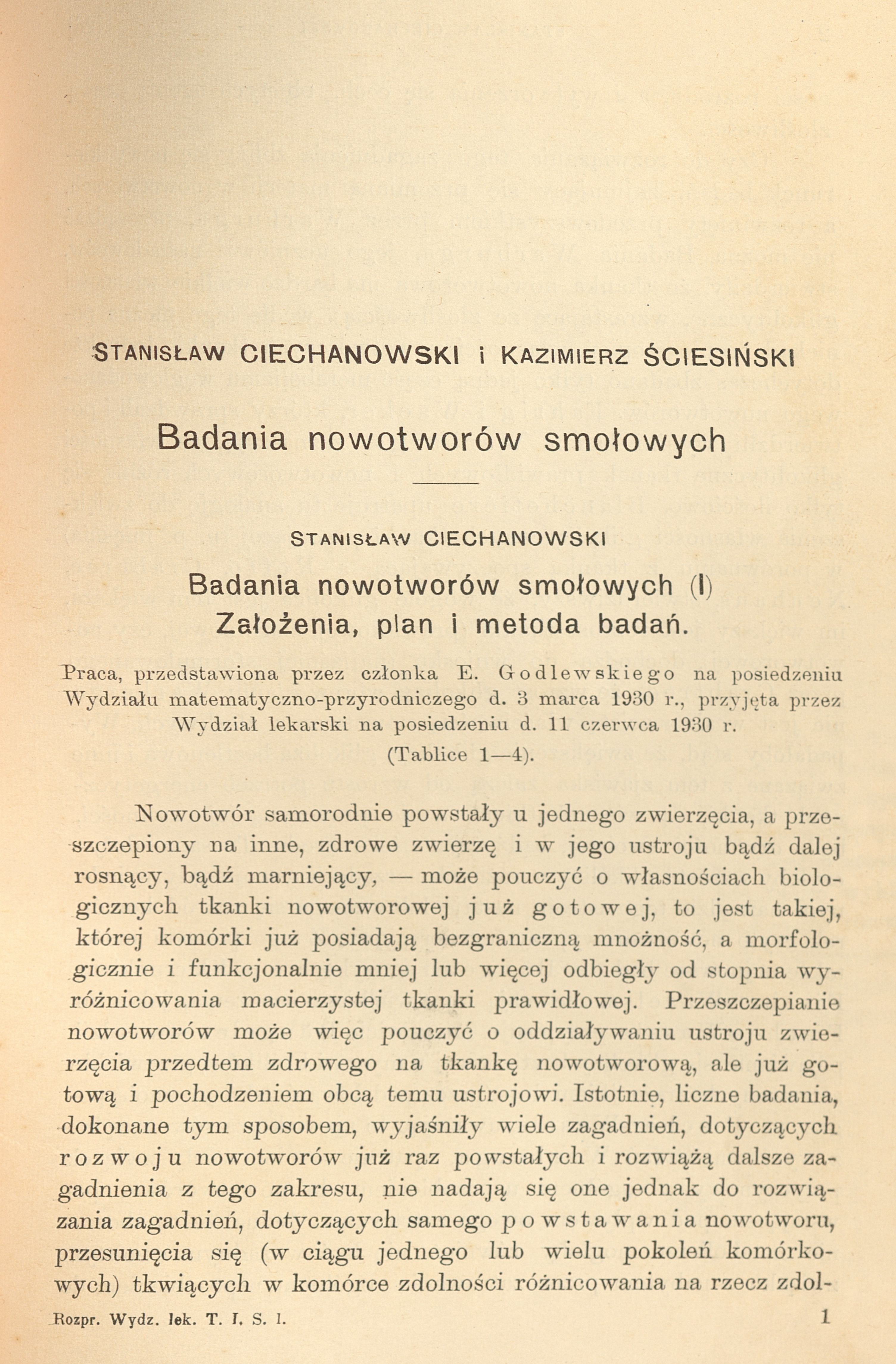 Początkowa strona publikacji „Badania nowotworów smołowych". Kraków, 1931.