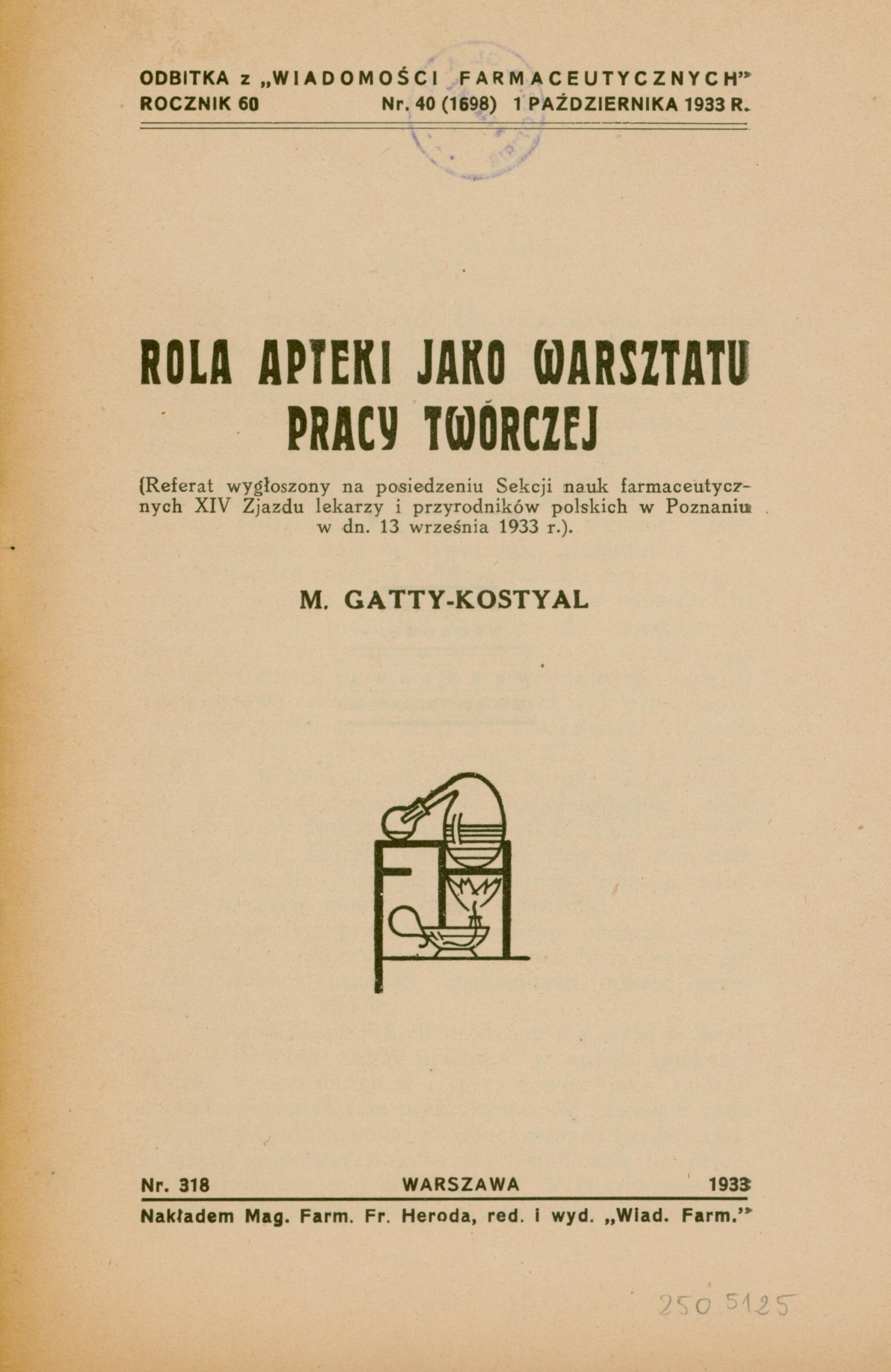 - Rola apteki jako warsztatu pracy twórczej / M. Gatty-Kostyal. - Warszawa, 1933