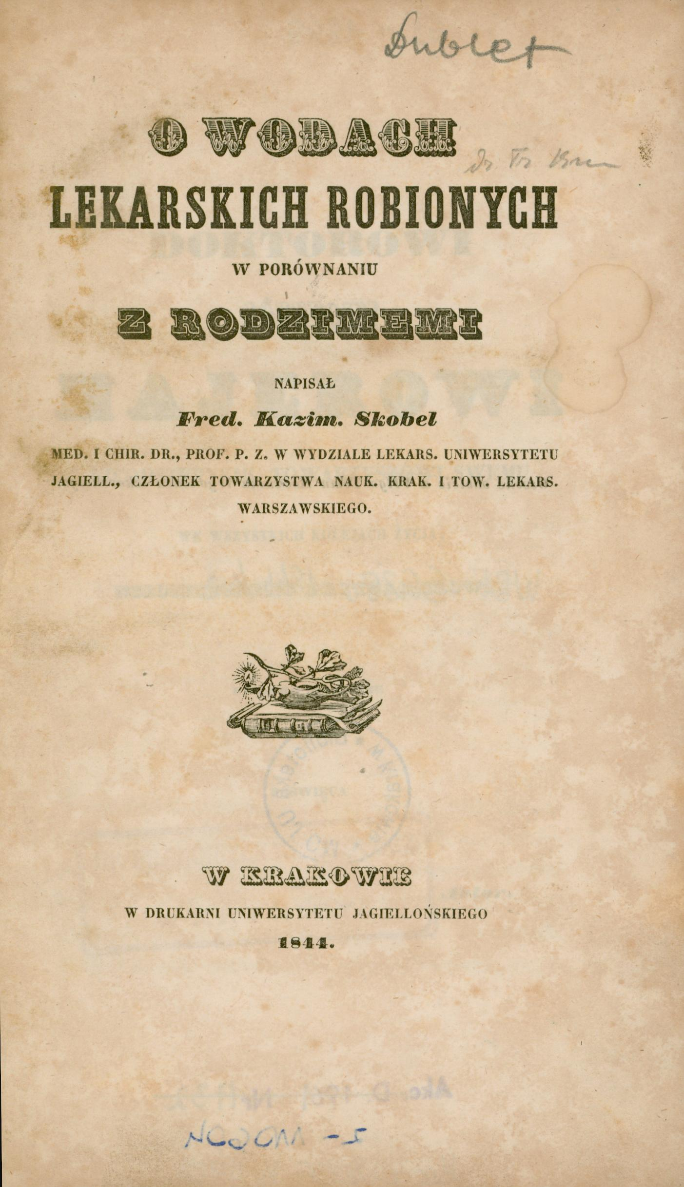 O wodach lekarskich robionych w porównaniu z rodzimemi / Fred. Kazim. Skobel. - Kraków, 1844