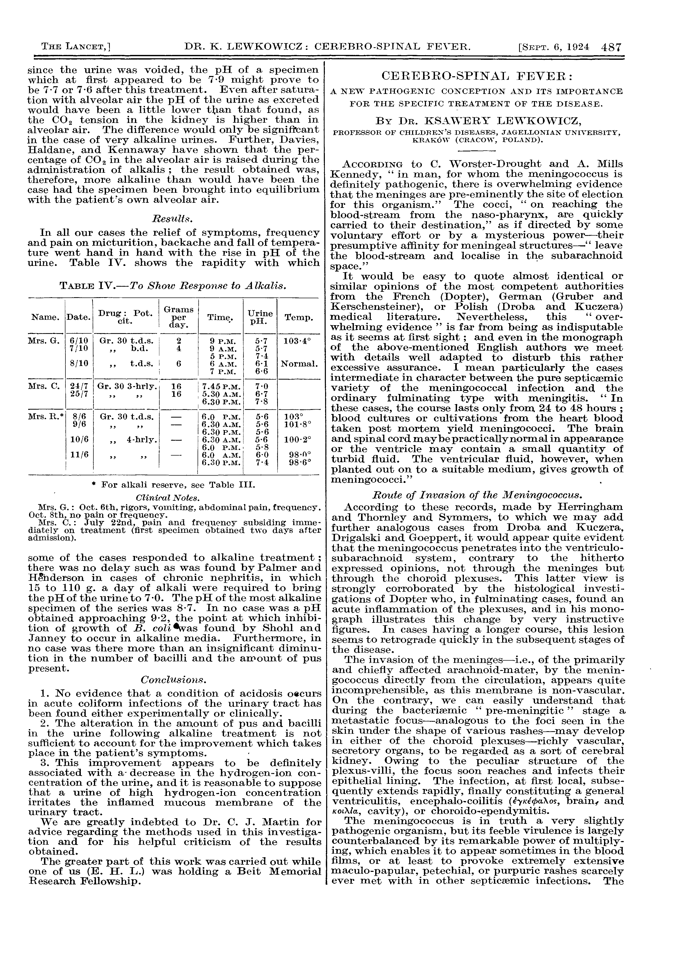Cerebro-Spinal Fever: A New Pathogenic Conception And Its Importance For The Specific Treatment Of The Disease, "The Lancet", 1924, vol. 2, 6 September, p. 487-491.