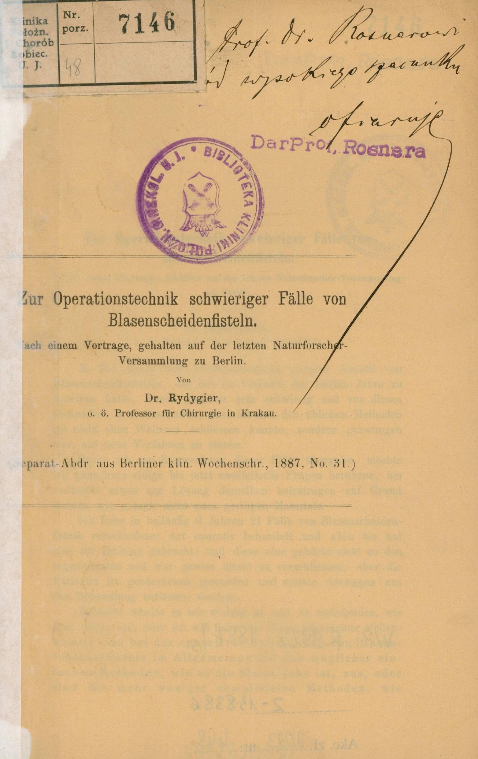 Zur Operationstechnik schwieriger Fälle von Blasenscheidenfisteln / Rydygier. - Berlin, 1887